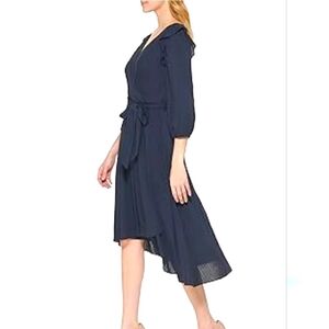 Navy wrap dress with ruffle details and three-quarter sleeves. Ideal for versatile styling.