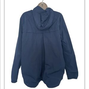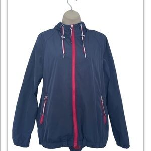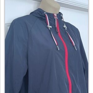 Tommy Hilfiger woman's full zip windbreaker jacket. Jacket is dark blue with red and white accents and toggle drawstrings. It's made of 100% polyester and is a woman's size small.