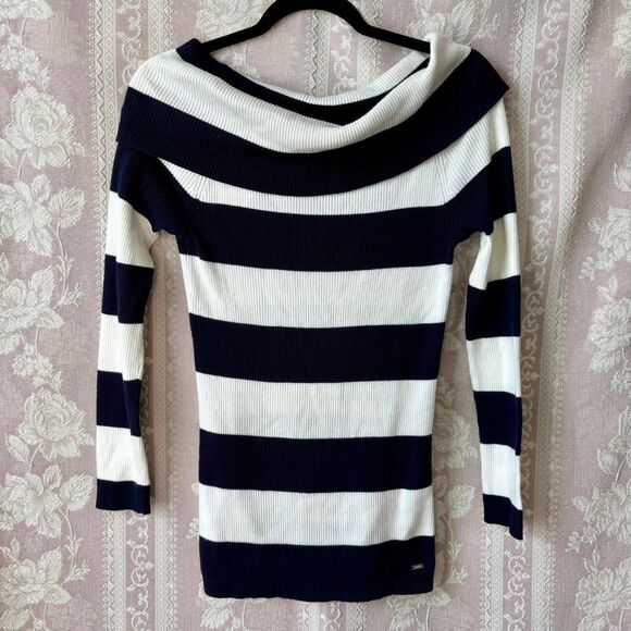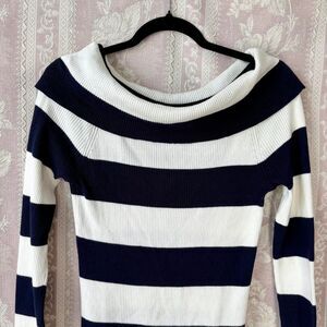 Cutest Tommy Hilfiger cotton off-the-shoulder cable-knit sweater in navy and white stripes. Soft and stretchy. Excellent condition. Originally $69