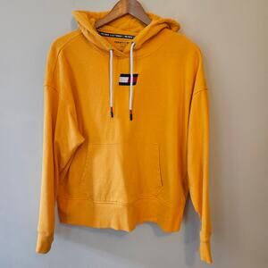 Tommy Hilfiger Sport women's bright yellow pullover hoodie, size large. This soft, lightweight French terry hoodie has an embroidered logo on the front.