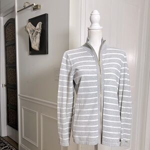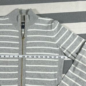 tommy hilfiger striped zip jacket womens large gray white nautical knit pima cotton blend coastal grandma chic preppy sporty casual breathable lightweight knit seaside layering spring summer fall travel sweater