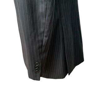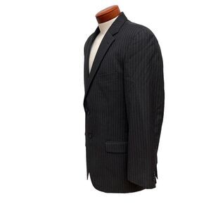 Lightweight dark grey jacket with faint blue stripes. Single breasted. Faux lower hip pockets, functional left chest pocket and inner pocket. 100% wool.