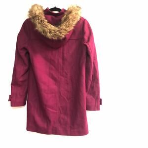 Tommy Hilfiger wool toggle-front hooded coat in a dark pink / magenta / fuchsia type color called Potion on the manufacturer tags. Size 4. Detachable hood with faux-fur around the edge.