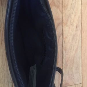 This black Tommy Hilfiger wristlet is new and unused with no tags. The body of the bag is cloth and the handle is leather.