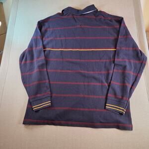 Classic Tommy Hilfiger preppy sweater in men’s XXL. Navy blue base with dark red horizontal stripes and a standout yellow stripe across the chest, plus matching yellow cuff accents. Made in Malaysia from 100% cotton, this pullover crewneck offers timeless collegiate-inspired style.