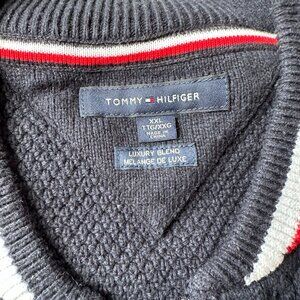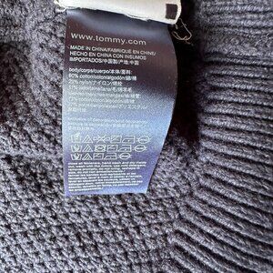 Beautiful and unique, two color sleeve Tommy Hilfiger Cotton Blend Sweater, Cable Pattern, Dark Blue Color, Tag indicates "Luxury Blend", and made of cotton. QR code searches rtto260043 fall 2019 78d9034 tommy hilfiger