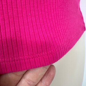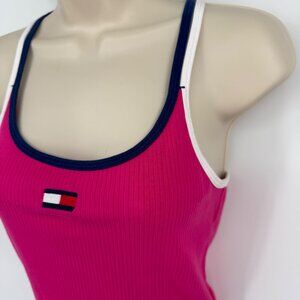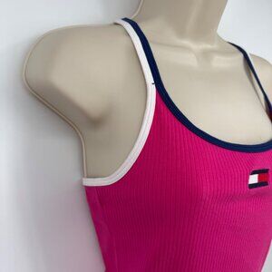 Tommy Hilfiger This vibrant fuchsia pink cropped tank top is perfect for trendy juniors. It features a ribbed texture and an embroidered logo with a stylish criss-cross design. Ideal for casual outings or pairing with high-waisted jeans.