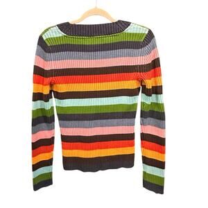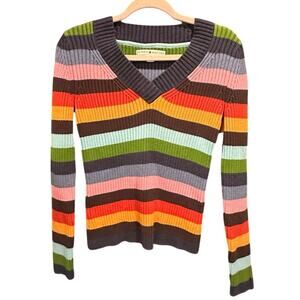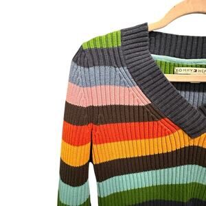 Tommy Hilfiger Y2K Multicolored V Neck Ribbed Knit Fitted Top Classic Preppy