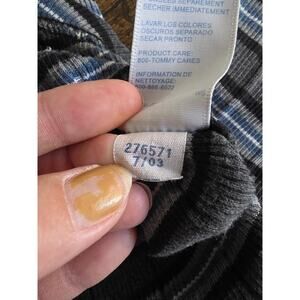 Vintage-inspired Tommy Hilfiger ribbed long sleeve top with classic grey, blue & white stripe pattern. Features a Henley snap-button neckline and soft stretchy ribbed fabric. Super flattering cropped fit — perfect for Y2K, casual streetwear, or layered fall looks.