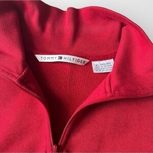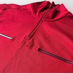 Tommy Hilfiger early Y2K bright red quarter zip sweatshirt. It features top-stitched signature color lines with tone-on-tone embroidery on the front, a terry texture lining, and long sleeves.