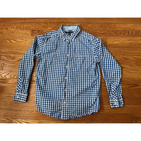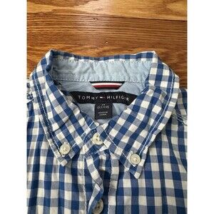 Tommy Hilfiger Youth Boys Blue Checkered Dress Shirt Size Med 12/14 100% Cotton