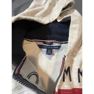 The product is a Tommy Hilfiger men's classic logo zip-up hoodie in size large. Made of cotton fabric, it features a full zip closure, lightweight design, and pockets for convenience. The white color and logo accents give it a stylish look, perfect for casual wear or activewear. Whether you're lounging at home or running errands, this hoodie offers comfort and fashion in one versatile piece.