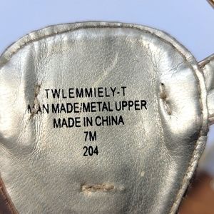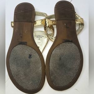 A gently used Tommy Hilfiger brand flat t-strap sandal in a gold snake skin print with gold logo. They are a size 7 with normal signs of wear. Maybe some minor imperfections, but very unnoticeable. Please check pics for details.