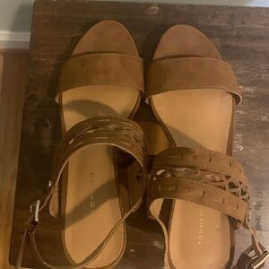 Tommy Hilfiger cork wedge sandals with leather straps and gold tone detailing..adjustable sling back straps with buckle..has 3” heel..gently used..