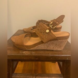 Tommy Hilfiger cork wedge sandals with leather straps and gold tone detailing..adjustable sling back straps with buckle..has 3” heel..gently used..