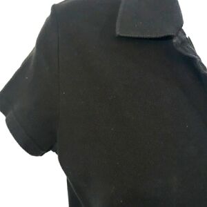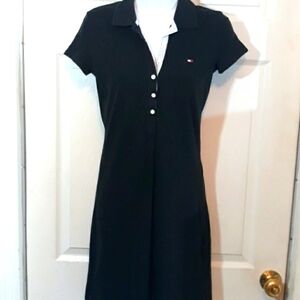 This is an adorable t shirt style dress by Tommy Hilfiger. It's in black has the light blue n white pin stripe underneath the 6 buttons on top. Has collar and short sleeves. Has the red white and blue logo on top left. Fits like a shirt and as it goes down it goes like A line. Has 2 little slits on each side of dress. This looks fantastic with a pair of sneakers!!! Measurements are approximately lying flat pit to pit 16" total length 32". Excellent condition!! Really cute!!