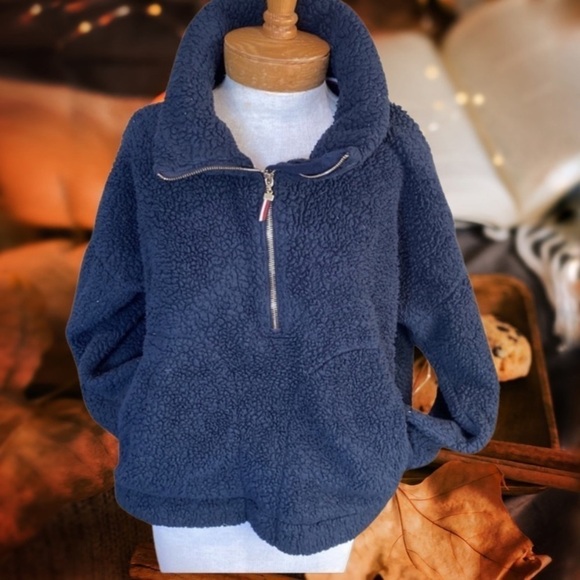 Tommy Hilfiger sherpa fleece pullover in a deep navy color. It features: has a little bit of pilling and what are you doing?wear