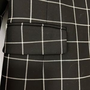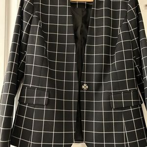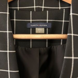 Gorgeous, perfect shape Tommy Hilfiger fitted blazer, black and white plaid type pattern button. Nice interior lining with red seam. I wore it with jeans and flats, but it’s gotten a little tight in my arm area.!