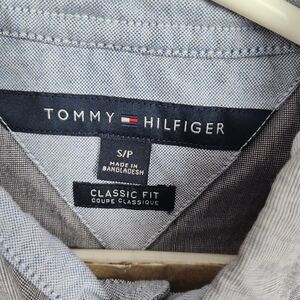 The Tommy Hilfiger men's button-up shirt in size S is a classic fit shirt in a stylish gray color. Made from cotton with a woven fabric type, this shirt features long sleeves and a collared neckline with a button-down collar style. Easy to care for, it is machine washable, making it a convenient and versatile addition to any man's wardrobe. The Tommy Hilfiger brand is known for its quality and timeless style, making this shirt a wardrobe staple for any man looking for a classic and comfortable button-up shirt.