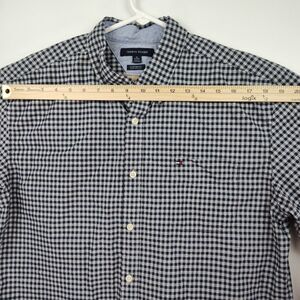 The Tommy Hilfiger men's button-up shirt in size XL features a classic blue and white plaid pattern, long sleeves, and a collared neckline with a button-down style. Made from 100% cotton knit fabric, this regular fit shirt is easy to care for with its machine washable design. Perfect for casual wear, this shirt exudes a timeless and stylish look with the renowned Tommy Hilfiger brand.