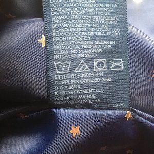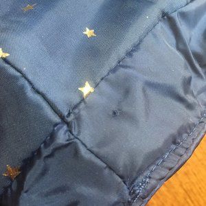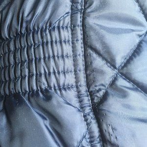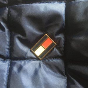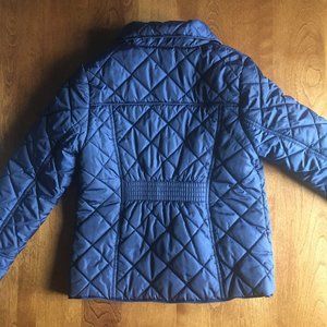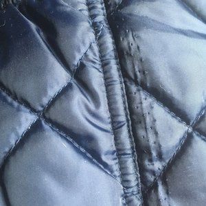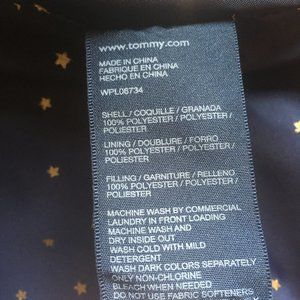 Tommy Hilfiger quilted jacket in girls's size Small (7). Navy blue with a slight sheen, and gold stars on the lining. Goldtone snaps up the front with pockets, and cute fitted tailoring on the back. Lightly insulated style appropriate for mildly cold weather. GUC; a few very small snags on the lining inside the sleeves, and there is a manufacturer's defect on a back seam where it looks like a seam was restitched (see photos).