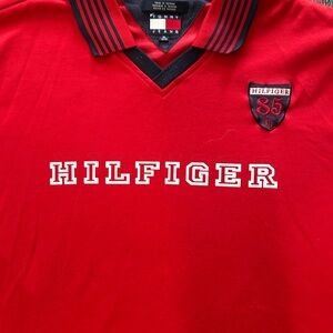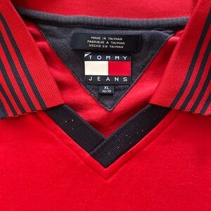 Bold red polo with embroidered logo. Classic collar and short sleeves. Perfect for casual wear.