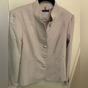 Tommy Hilfiger size 6 Blazer with buttons on front. Long sleeves, has finger pockets. Linens inside feels silky and they collar are not folded but straight up. Has pen ink in red and couple of markers on one sleeve.