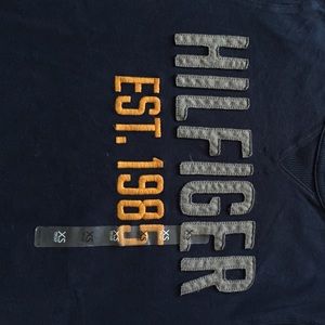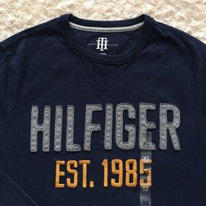 Tommy Hilfiger sweatshirt material shirt men's SZ XS , navy blue in color , with big logo cross the chest , brand new with tags .