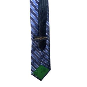 Tommy Hilfiger diagonal stripe tie. Darker blue, lighter blue and lime green. Excellent preowned condition. 59 inches long