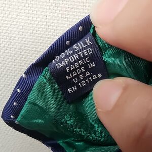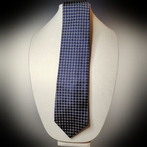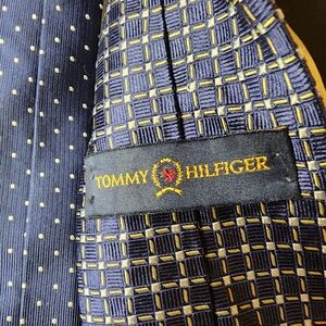 Silk Tommy Hilfiger tie with blue background and silver and gold accents.