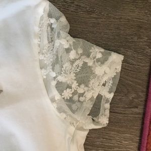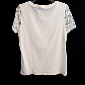 Logo in gray print which has a textured feel to the touch.. The sleeves are a beautiful lace with small flower designs. Please note that the tag says medium but the top is a large. Must have been a production error so. See measurements.