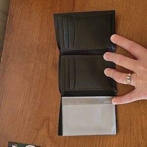 Tommy Hilfiger leather tri-fold wallet. It is dark brown, I just can't get the picture right. Several pockets inside & 2 places to put your money. Nothing wrong with it. Smoke and Pet free home.