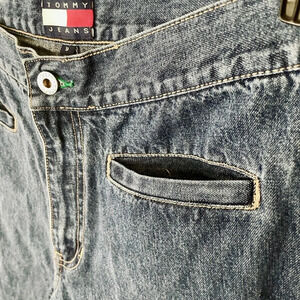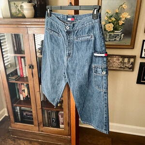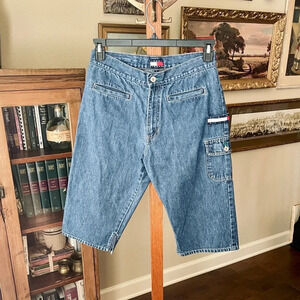 Tommy Hilfiger vintage 90s Y2K women’s long denim jean shorts/capris, carpenter loop, cargo pocket, 2 front pockets, no back pockets, zip fly, 100% cotton.