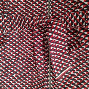 Chic red patterned hooded rain jacket from Tommy Hilfiger, with TH logo patch on the sleeve. Features a zip front and adjustable waist tie. Super cute year-round jacket! Excellent vintage condition. There is a mark on the lining but the exterior is fantastic.