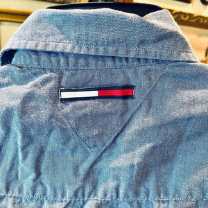 Tommy Hilfiger women’s sleeveless button cotton chambray top, breast pockets, 100% cotton, embroidered Hilfiger logos.