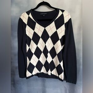 Tommy Hilfiger women’s size M argyle navy and white long sleeved v-neck top EUC