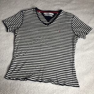 Tommy Hilfiger y2k striped vneck dark blue white tshirt top medium