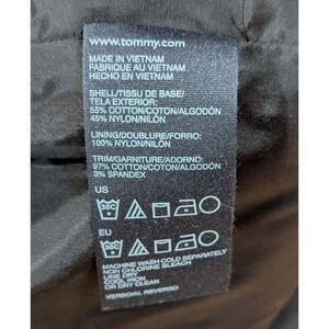 This classic black trench coat by Tommy Hilfiger features a double-breasted front and a belted waist, offering a tailored and sophisticated silhouette. Crafted from a smooth, water-resistant material, it combines timeless style with practical functionality, making it an essential addition to any wardrobe.