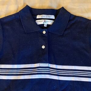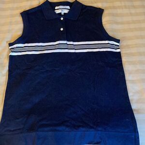 Tommy Hilfiger sleeveless woman’s golf polo shirt in navy with white stripes across the chest and continuing to back of shirt. Polo collar, 2 button placket and side slits. Ribbed collar, armbands and hem. Size Medium. Excellent condition.