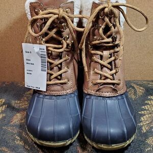 Faux-fur collar; duck-boot styling