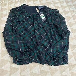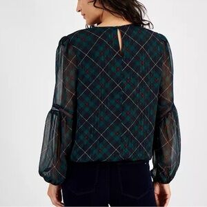 Dress up for your next holiday party in this sophisticated blouse by Tommy Hilfiger, complete with a metallic plaid print and sheer sleeves.