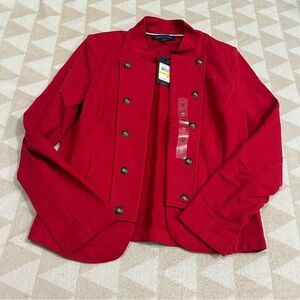 Tommy Hilfiger keeps you in fashion step with this button-detailed military band jacket that's an edgier alternative to a blazer.