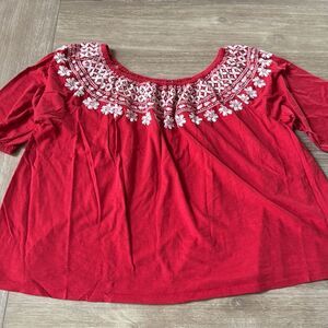Stylish red off-shoulder top with intricate white embroidery. Perfect for casual outings and comfortable wear.