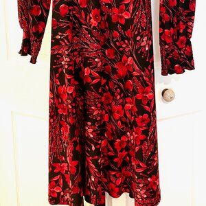 Tommy Hilfinger Black with Red Flowers Side Wrap Dress Scrunch sleeves Size 14 (but more like a size 12)