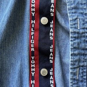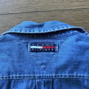 For sale is a classic blue denim button-up shirt from Tommy Hilfiger Jeans in size M for men. Featuring a collared neckline and spread collar style, this shirt is perfect for casual occasions in both fall and winter seasons. The shirt is made from 100% cotton fabric and has a regular fit. It has long sleeves and a pocket on the front with the Tommy Hilfiger Jeans logo accent. This shirt is part of the Tommy Jeans product line and has a vintage feel to it with a 90s theme. Handmade in Indonesia, this button-up shirt is machine washable for easy care and maintenance.
