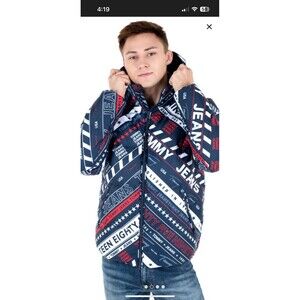 Tommy Jeans Hooded All-Over Logo Down Puffer Jacket Size Large NWOT