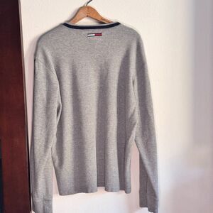 Tommy Jeans Men’s Long Sleeve V-Neck Sweater Gray Stripe Sleeve Logo Size L Y2K