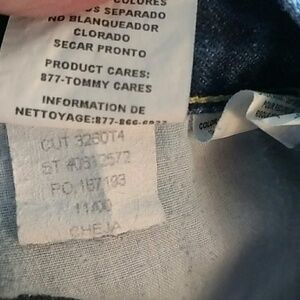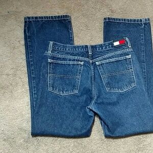 Tommy Jeans by Tommy Hilfiger Dark Wash with classic bar logo. Size 11/30 rn#66476 from 11/00 almost vintage flat lay measured waist 16" Rise 9.5” Inseam 29" across hips at bottom of zipper 20" Great mom style jeans