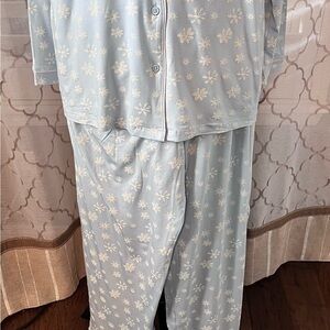 Comfortable light blue pajama set with white floral pattern. Button-up top and matching pants. Soft and stylish for a cozy night in.