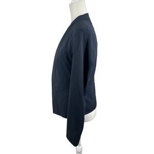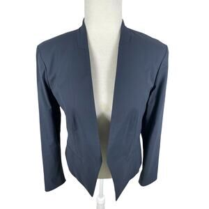 Open front blazer with four way stretch. Inside zip pocket. 51% cotton, 45% nylon, 4% lycra. Navy blue. Size medium. Please see photos for measurements.